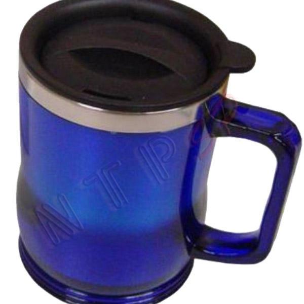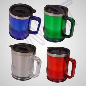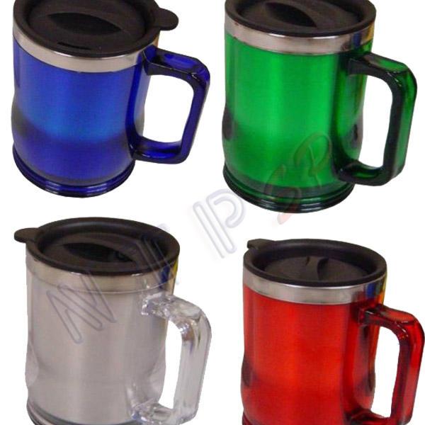 Caneca em metal, revestida em acrílico, com tampa de pressão.